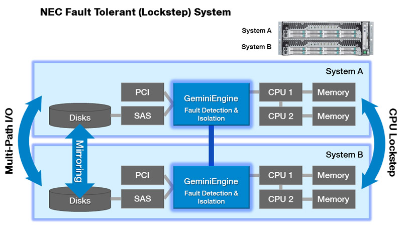 Unsere Fehlertoleranzkonzepte unterscheiden sich von Hochverfügbarkeits-Cluster. In klassischem Fall sind zwei Maschinen mit jeweils einem eigenen Betriebssystem und zwei Sets von Applikationssoftware ausgestattet. Clustering- und Datenreplizierungs-Software sorgt hier dafür, dass im Falle von Systemstörungen die Arbeit mit laufenden Applikationen von einem Produktivsystem auf eine Backup-Maschine verlagert wird. Bei einem fehlertoleranten System von uns hingegen werden das Produktiv- und das Backup-System schon auf Speicherebene gekoppelt und nicht erst auf I/O-Level. Der Benutzer bekommt im Fall von Störungen diese gar nicht mit, weil im Gegensatz zu einem herkömlichen Hochverfügbarkeits-Cluster kein Systemübergang (ein so genanntes Failover) stattfindet.
